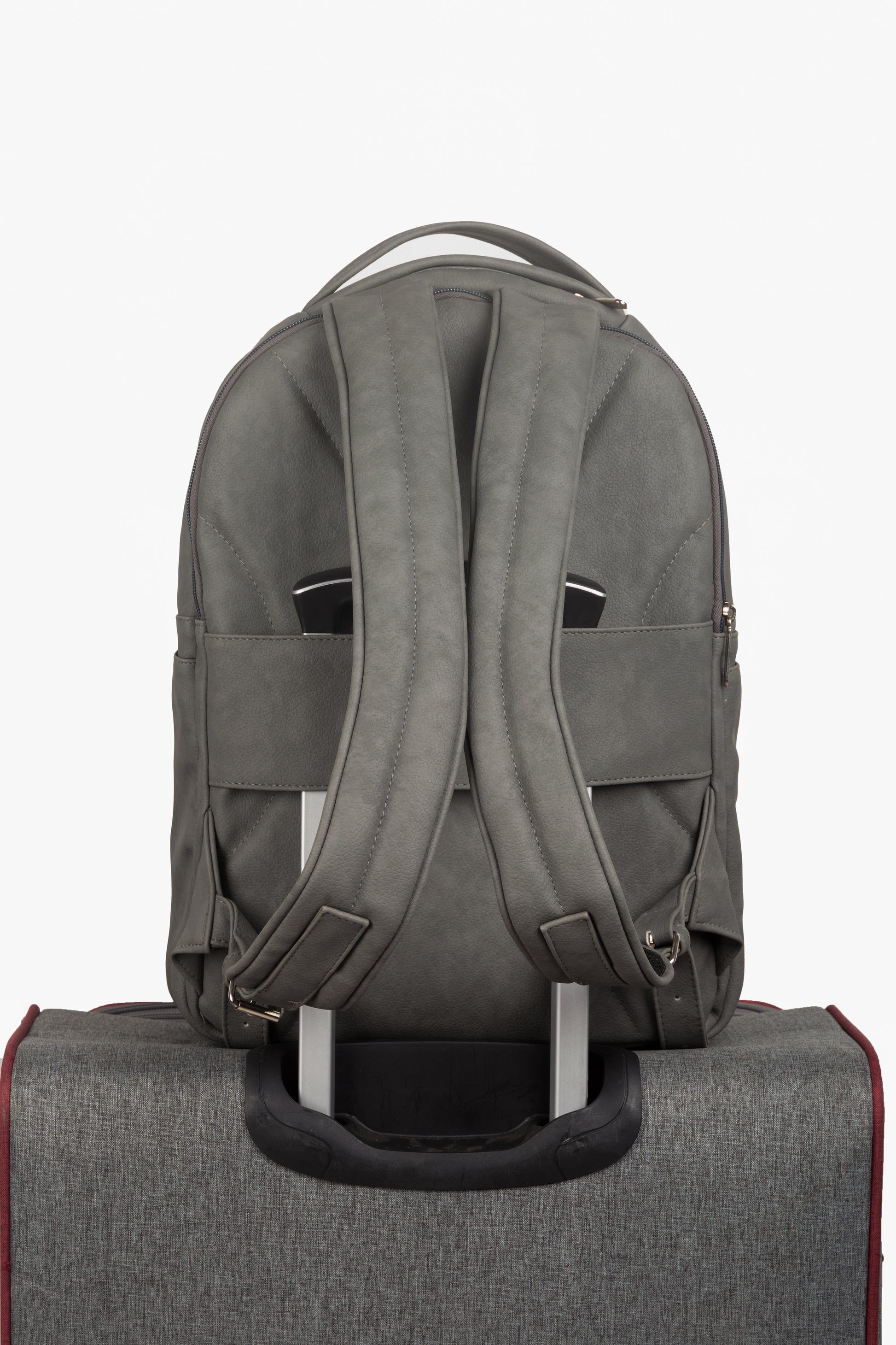 Pensado para acompañarte en movimiento, incorpora una banda trasera que encaja con precisión en la barra de una maleta de cabina, facilitando el desplazamiento en viajes y trayectos largos.