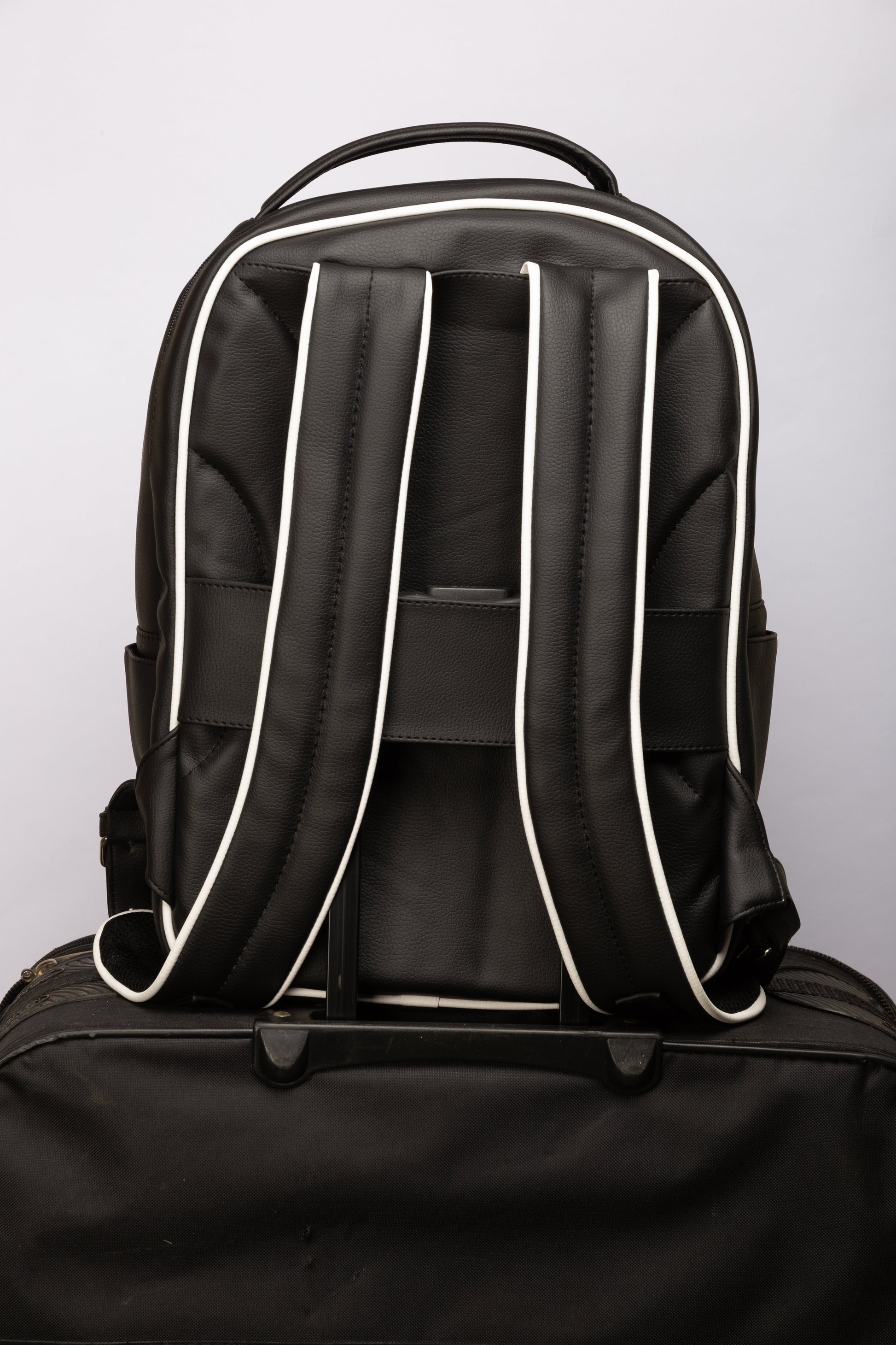 Nuestro T21 está elaborado en cuero vegano de pvc 100% colombiano, de la mejor calidad del mercado. Se diferencia de nuestro M30 por tener un compartimento específico con capacidad para dos laptops de hasta 16´pulgadas, viene con su bolsillo principal y bolsillo mediano que se encuentra en la parte delantera del morral. Está diseñado para ser un producto cómodo a la hora de viajar y por ese motivo le hemos añadido una banda en la parte trasera que encaja a la perfección en la barra de la maleta.